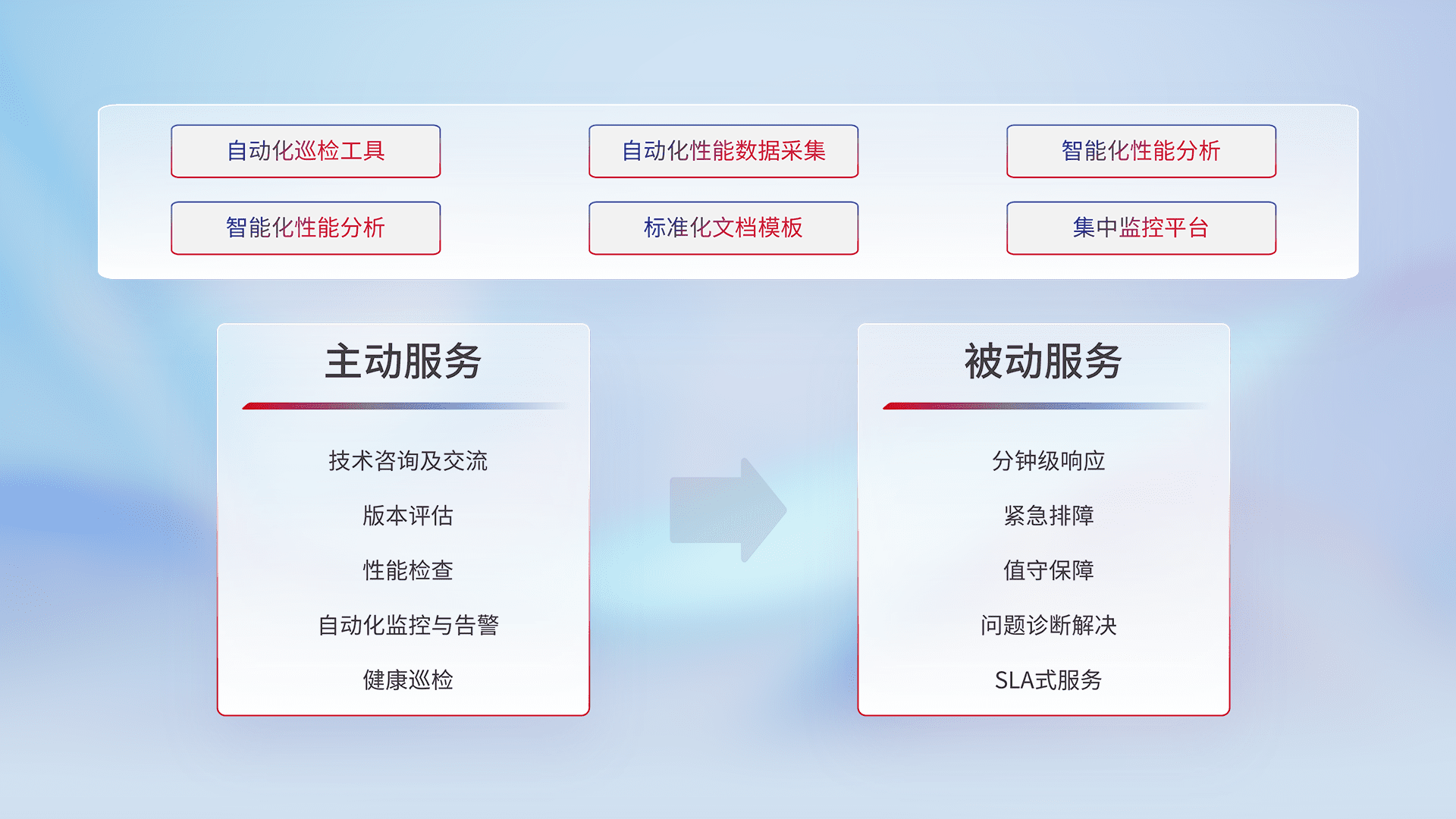智能化工具和标准化文档,,保障服务质量,,,,提供主动服务(包含技术咨询、、、、版本评估、、性能检查、、自动化监控与告警、、健康巡检)和被动服务包含(分钟级响应、、、、紧急排障、、、、值守保障、、问题诊断解决、、、SLA服务)。。